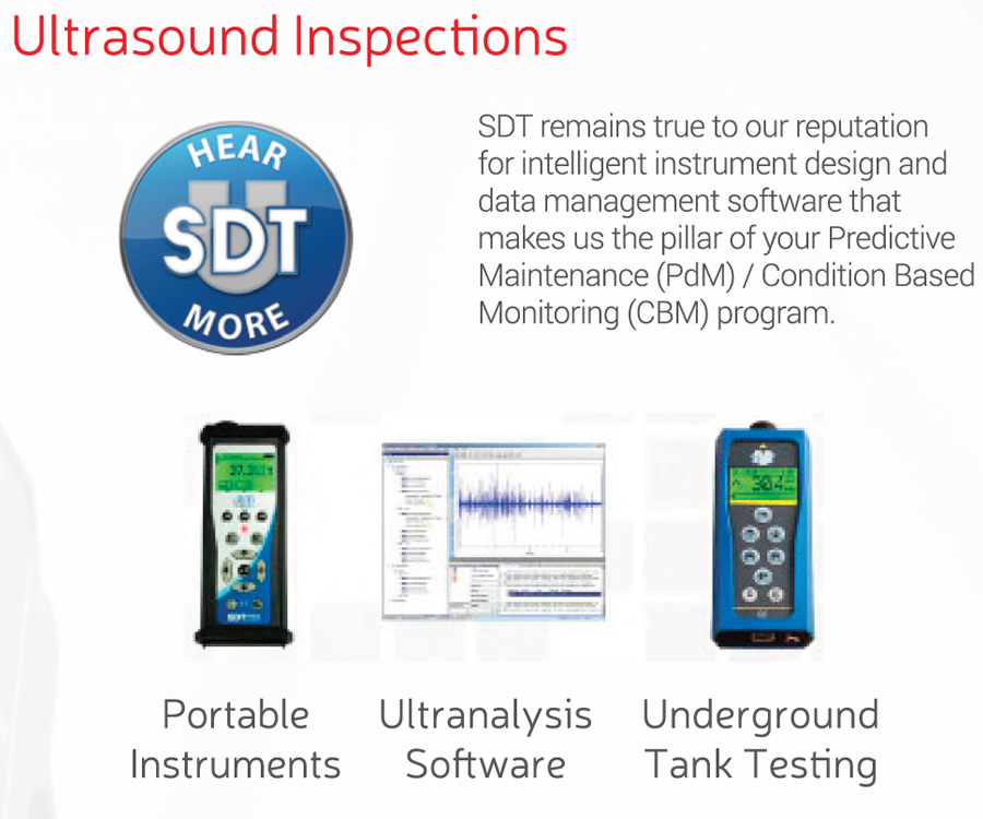 Predictive Maintenance Technologies: Vibration Analysis, Infrared Thermography, Airborne Ultrasound, Oil Analysis; Process Parameter Monitoring, Motor Current Analysis, Non Destructive Examination: Flaw Detection, Ultrasonic Thickness Test (Tanks/Piping).